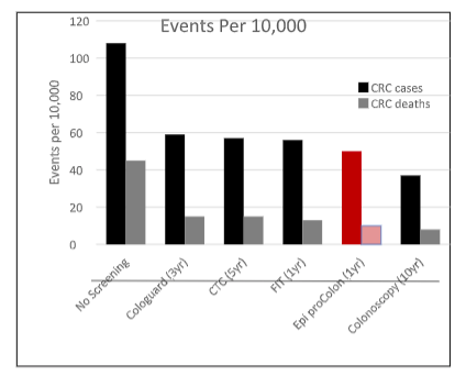At a recent University of Miami health fair, it was noted that screening rates for colorectal cancer increased from 10% with a stool test to 95% with a blood test. That is how well a blood test is welcomed. In addition, a recent National Cancer Institute publication concluded that FDA- approved Epi proColon is the ‘Test of Choice’ for patients refusing colonoscopy and stool testing. Other than colonoscopy, annually administered Epi proColon performed better (decreased cases and deaths per chart) than all other screening methods. Most notably, Epi proColon is much better than “No Screening.”